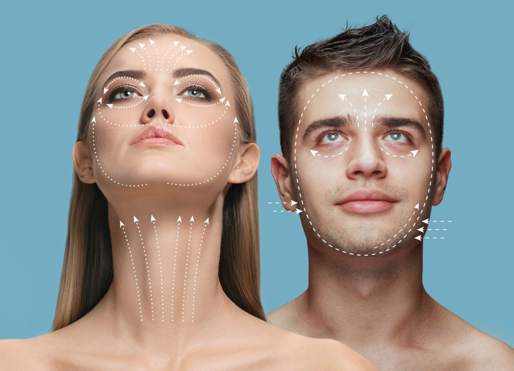 Face lifting, circuit. Young man and woman with arrows on face symbolling face lifting effects with cosmetological treatment